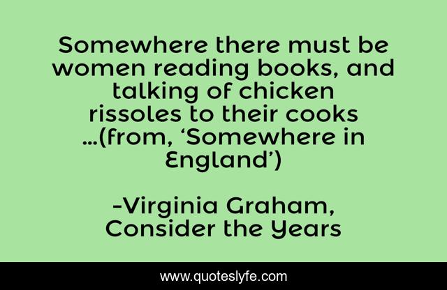 This page presents the quote "Somewhere there must be women reading books, and talking of chicken rissoles to their cooks …(from, ‘Somewhere in England’)". Author of this quote is Virginia Graham, Consider the Years. .