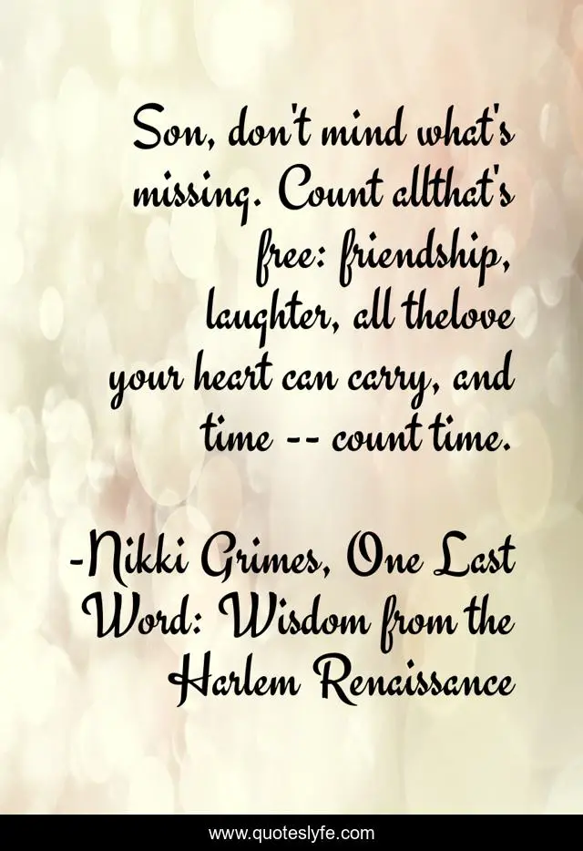 This page presents the quote "Son, don't mind what's missing. Count allthat's free: friendship, laughter, all thelove your heart can carry, and time -- count time.". Author of this quote is Nikki Grimes, One Last Word: Wisdom from the Harlem Renaissance. This quote is about love, friendship, one-last-word, time, laughter, affection, what-matters,.