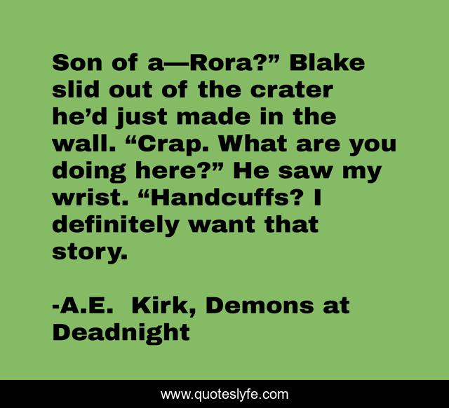 This page presents the quote "Son of a—Rora?” Blake slid out of the crater he’d just made in the wall. “Crap. What are you doing here?” He saw my wrist. “Handcuffs? I definitely want that story.". Author of this quote is A.E. Kirk, Demons at Deadnight. This quote is about funny, comedy, paranormal-romance, team-blake,.