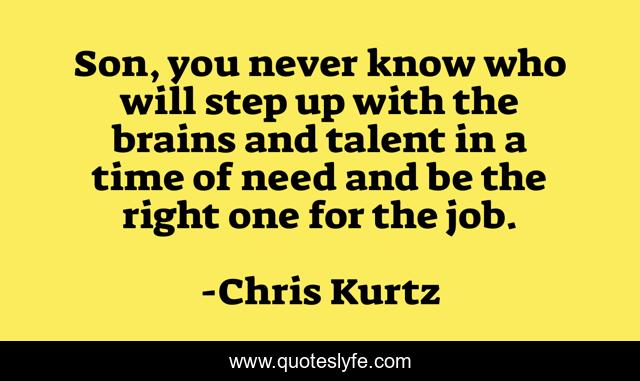 This page presents the quote "Son, you never know who will step up with the brains and talent in a time of need and be the right one for the job.". Author of this quote is Chris Kurtz. This quote is about brains, talent, intelligence,.