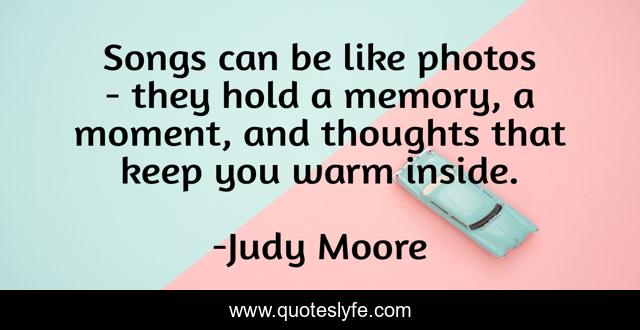 This page presents the quote "Songs can be like photos - they hold a memory, a moment, and thoughts that keep you warm inside.". Author of this quote is Judy Moore. This quote is about photographs, memories, songs,.