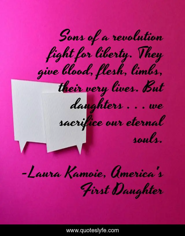 This page presents the quote "Sons of a revolution fight for liberty. They give blood, flesh, limbs, their very lives. But daughters . . . we sacrifice our eternal souls.". Author of this quote is Laura Kamoie, America's First Daughter. This quote is about women-s-fiction, historical-fiction, historical,.