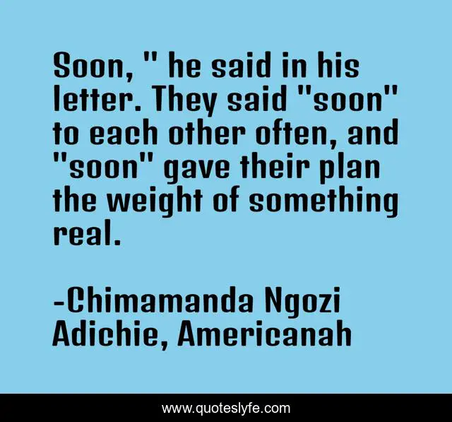 This page presents the quote "Soon, " he said in his letter. They said "soon" to each other often, and "soon" gave their plan the weight of something real.". Author of this quote is Chimamanda Ngozi Adichie, Americanah. This quote is about romance, waiting, love, pining, affection,.