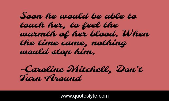 This page presents the quote "Soon he would be able to touch her, to feel the warmth of her blood. When the time came, nothing would stop him.". Author of this quote is Caroline Mitchell, Don't Turn Around. This quote is about mystery, supernatural-crime, crime-thriller,.