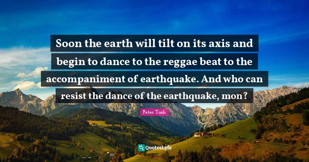 This page presents the quote "Soon the earth will tilt on its axis and begin to dance to the reggae beat to the accompaniment of earthquake. And who can resist the dance of the earthquake, mon?". Author of this quote is Peter Tosh. This quote is about earth, reggae, tilt, earthquakes, dance, axes,.