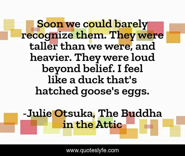 This page presents the quote "Soon we could barely recognize them. They were taller than we were, and heavier. They were loud beyond belief. I feel like a duck that's hatched goose's eggs.". Author of this quote is Julie Otsuka, The Buddha in the Attic. This quote is about japan, fiction, immigrant-experience,.