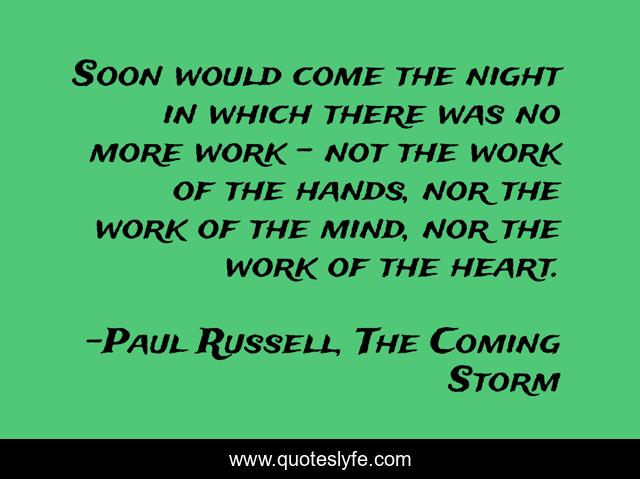 This page presents the quote "Soon would come the night in which there was no more work – not the work of the hands, nor the work of the mind, nor the work of the heart.". Author of this quote is Paul Russell, The Coming Storm. This quote is about heart, hands, work, mind, night,.