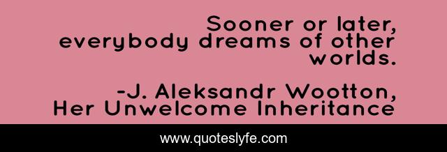 This page presents the quote "Sooner or later, everybody dreams of other worlds.". Author of this quote is J. Aleksandr Wootton, Her Unwelcome Inheritance. This quote is about human-experience, travel, dreaming, otherworldly, escape, space-exploration,.