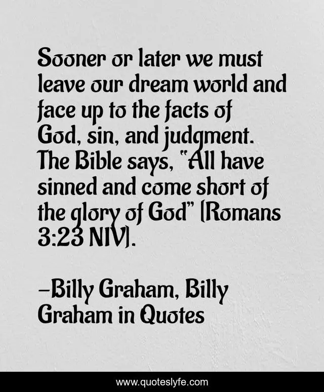 This page presents the quote "Sooner or later we must leave our dream world and face up to the facts of God, sin, and judgment. The Bible says, “All have sinned and come short of the glory of God” [Romans 3:23 NIV].". Author of this quote is Billy Graham, Billy Graham in Quotes. This quote is about god, judgment, sin, billy-graham,.