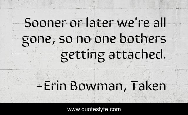 This page presents the quote "Sooner or later we're all gone, so no one bothers getting attached.". Author of this quote is Erin Bowman, Taken. .