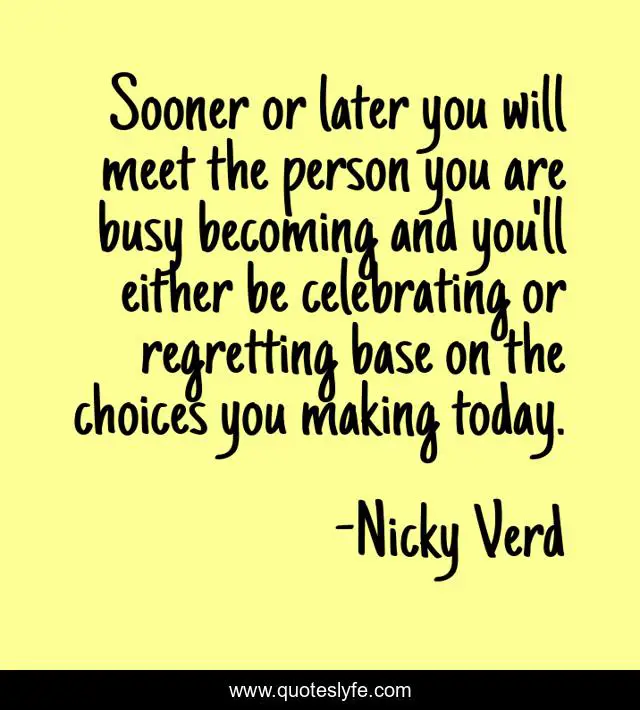 This page presents the quote "Sooner or later you will meet the person you are busy becoming and you'll either be celebrating or regretting base on the choices you making today.". Author of this quote is Nicky Verd. This quote is about motivation, positive-mind, focus-on-your-dreams, life, choices, purpose, inspirational, enthusiasm, mindset,.