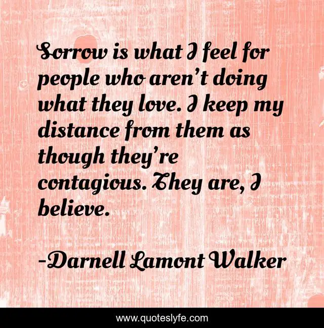 This page presents the quote "Sorrow is what I feel for people who aren’t doing what they love. I keep my distance from them as though they’re contagious. They are, I believe.". Author of this quote is Darnell Lamont Walker. .