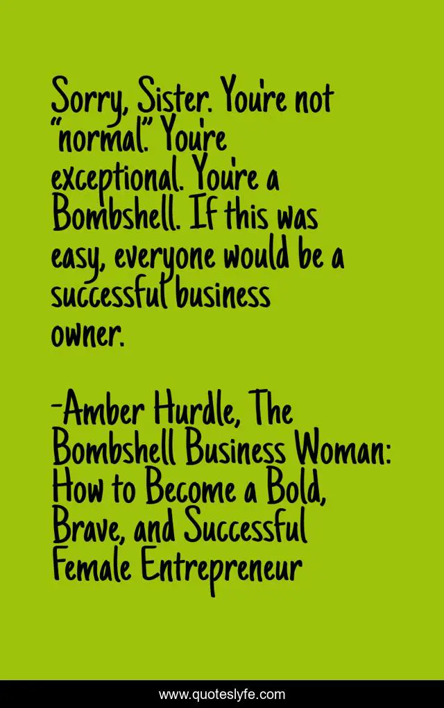 This page presents the quote "Sorry, Sister. You're not “normal.” You're exceptional. You're a Bombshell. If this was easy, everyone would be a successful business owner.". Author of this quote is Amber Hurdle, The Bombshell Business Woman: How to Become a Bold, Brave, and Successful Female Entrepreneur. This quote is about womens-inspirational, individuality, business-advice, success, personal-growth, women-empowerment, womens-strength, women-in-business,.