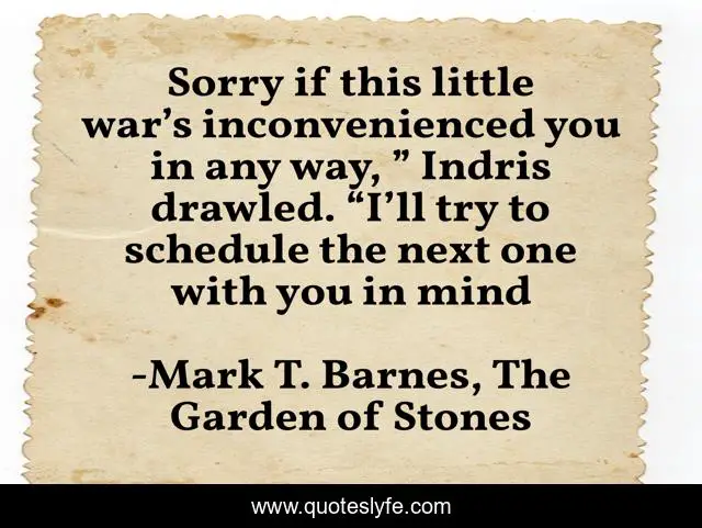 This page presents the quote "Sorry if this little war’s inconvenienced you in any way, ” Indris drawled. “I’ll try to schedule the next one with you in mind". Author of this quote is Mark T. Barnes, The Garden of Stones. This quote is about sarcasm, indris,.
