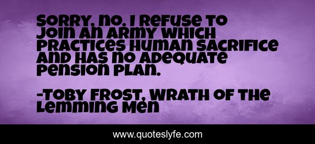 This page presents the quote "Sorry, no. I refuse to join an army which practices human sacrifice and has no adequate pension plan.". Author of this quote is Toby Frost, Wrath of the Lemming Men. This quote is about sci-fi, humour,.