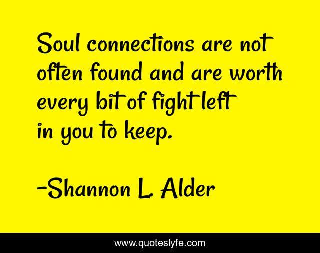 This page presents the quote "Soul connections are not often found and are worth every bit of fight left in you to keep.". Author of this quote is Shannon L. Alder. This quote is about love, fight, connections, spirituality, unrequited-love, friendship, soul-connection, affection,.