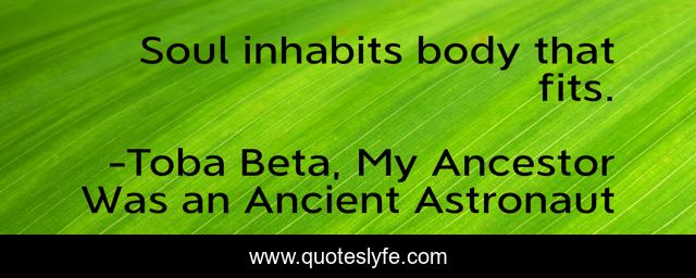 This page presents the quote "Soul inhabits body that fits.". Author of this quote is Toba Beta, My Ancestor Was an Ancient Astronaut. This quote is about body, soul, fit,.