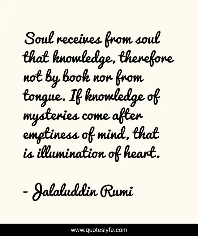 This page presents the quote "Soul receives from soul that knowledge, therefore not by book nor from tongue. If knowledge of mysteries come after emptiness of mind, that is illumination of heart.". Author of this quote is Jalaluddin Rumi. This quote is about enthusiasm, spiritual, poetry, inspirational,.