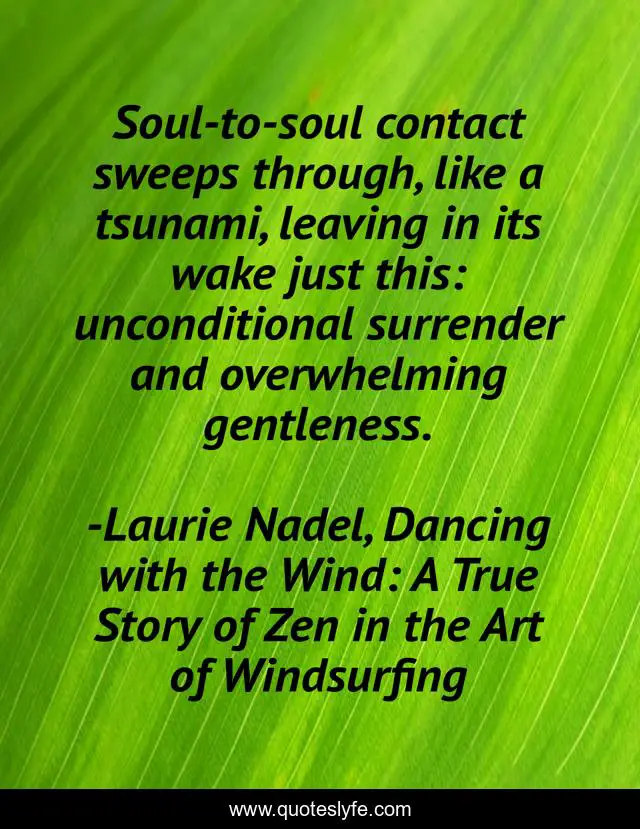This page presents the quote "Soul-to-soul contact sweeps through, like a tsunami, leaving in its wake just this: unconditional surrender and overwhelming gentleness.". Author of this quote is Laurie Nadel, Dancing with the Wind: A True Story of Zen in the Art of Windsurfing. This quote is about love, quote-of-the-day, soul, dan-rather, wayne-dyer, inspirational, quote-about-life, enthusiasm, quotes-twitter,.