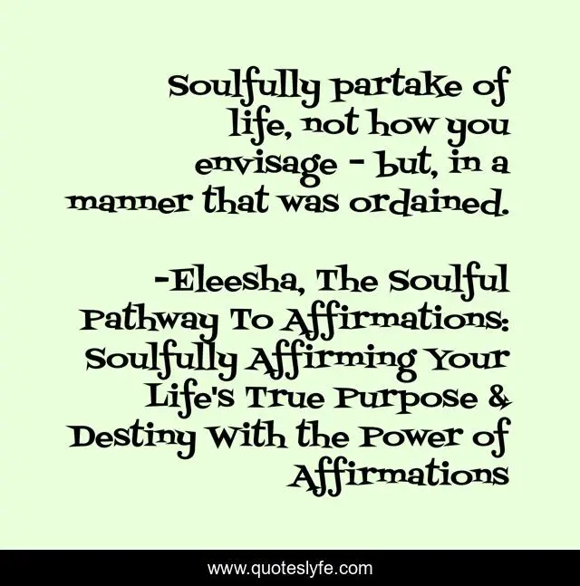This page presents the quote "Soulfully partake of life, not how you envisage – but, in a manner that was ordained.". Author of this quote is Eleesha, The Soulful Pathway To Affirmations: Soulfully Affirming Your Life's True Purpose & Destiny With the Power of Affirmations. This quote is about empowerment, positive, motivational, soul, quotes, channeling, inspirational, affirmations, enthusiasm,.