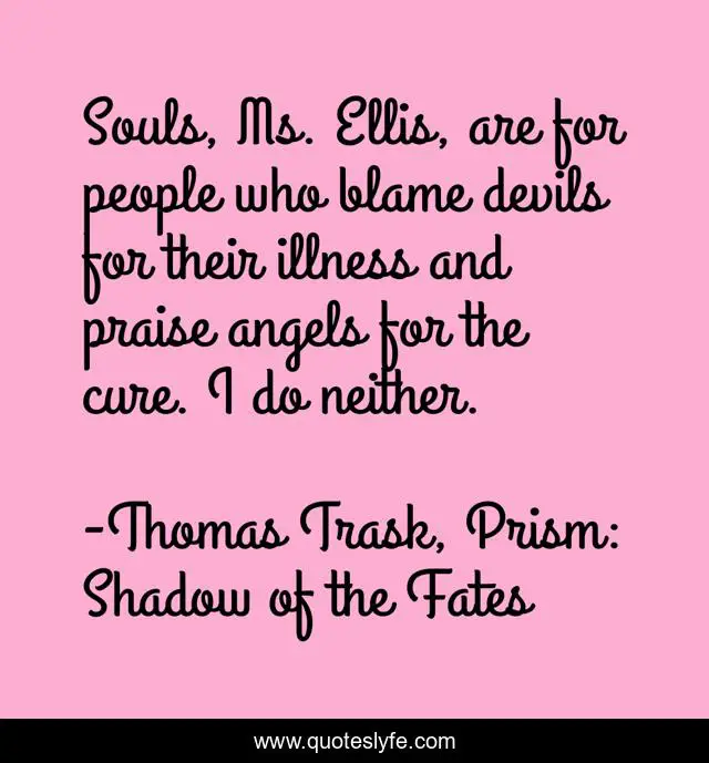 This page presents the quote "Souls, Ms. Ellis, are for people who blame devils for their illness and praise angels for the cure. I do neither.". Author of this quote is Thomas Trask, Prism: Shadow of the Fates. This quote is about trask, science-fiction,.