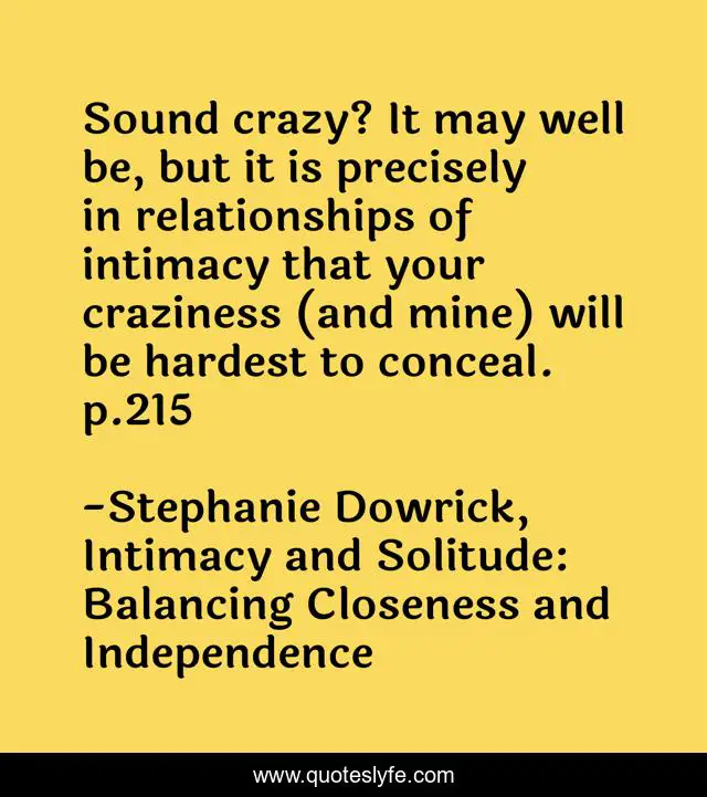 This page presents the quote "Sound crazy? It may well be, but it is precisely in relationships of intimacy that your craziness (and mine) will be hardest to conceal. p.215". Author of this quote is Stephanie Dowrick, Intimacy and Solitude: Balancing Closeness and Independence. This quote is about relationships, intimacy, solitude,.