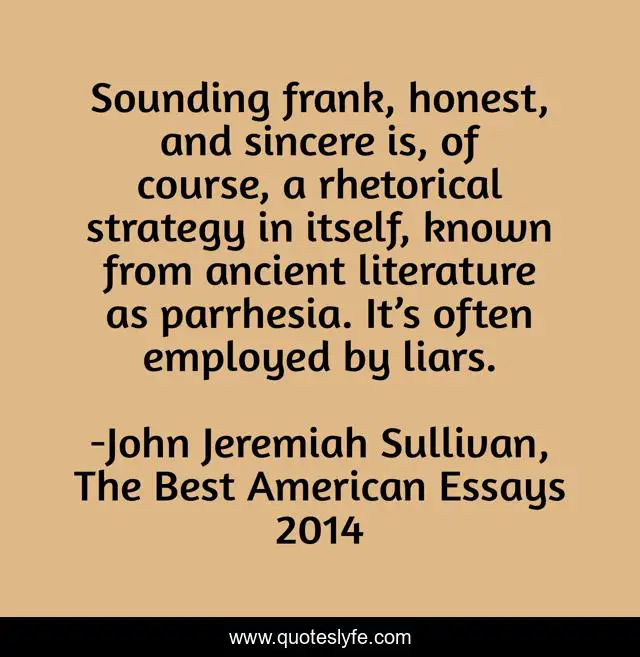 "John Jeremiah Sullivan, The Best American Essays 2014 Quotes." Quoteslyfe.com, 2025. Fri. 05 Dec. 2025. <https://www.quoteslyfe.com/quote/Sounding-frank-honest-and-sincere-is-of-255575>.