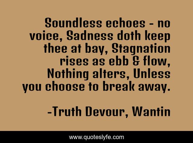 This page presents the quote "Soundless echoes - no voice, Sadness doth keep thee at bay, Stagnation rises as ebb & flow, Nothing alters, Unless you choose to break away.". Author of this quote is Truth Devour, Wantin. This quote is about change, sadness, life-lessons, refrain,.