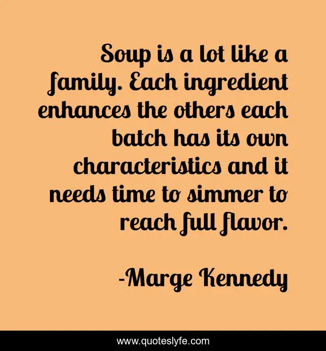 "Marge Kennedy Quotes." Quoteslyfe.com, 2025. Mon. 08 Dec. 2025. <https://www.quoteslyfe.com/quote/Soup-is-a-lot-like-a-family-298788>.