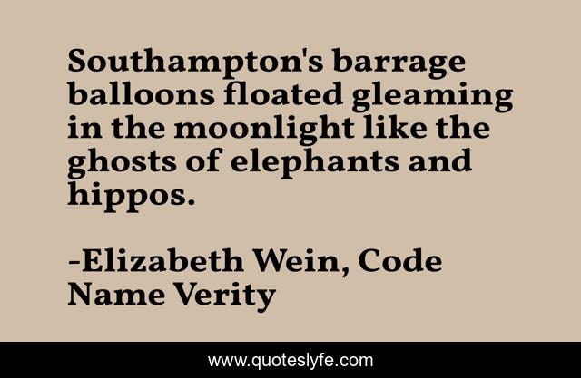 This page presents the quote "Southampton's barrage balloons floated gleaming in the moonlight like the ghosts of elephants and hippos.". Author of this quote is Elizabeth Wein, Code Name Verity. This quote is about moonlight, hippos, ghosts, elephants, simile,.