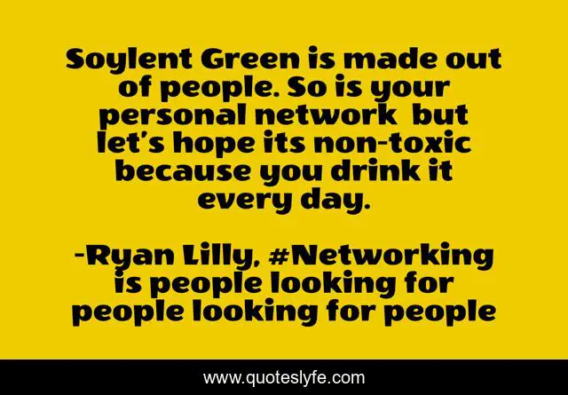 "Ryan Lilly, #Networking is people looking for people looking for people Quotes." Quoteslyfe.com, 2025. Sat. 06 Dec. 2025. <https://www.quoteslyfe.com/quote/Soylent-Green-is-made-out-of-people-168268>.