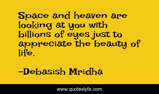 This page presents the quote "Space and heaven are looking at you with billions of eyes just to appreciate the beauty of life.". Author of this quote is Debasish Mridha. This quote is about heaven, space, philosophy, debasish-mridha, quotes, inspirational, enthusiasm, beauty-of-life, debasish-mridha-m-d,.