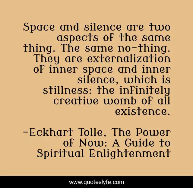 "Eckhart Tolle, The Power of Now: A Guide to Spiritual Enlightenment Quotes." Quoteslyfe.com, 2025. Fri. 05 Dec. 2025. <https://www.quoteslyfe.com/quote/Space-and-silence-are-two-aspects-of-168481>.