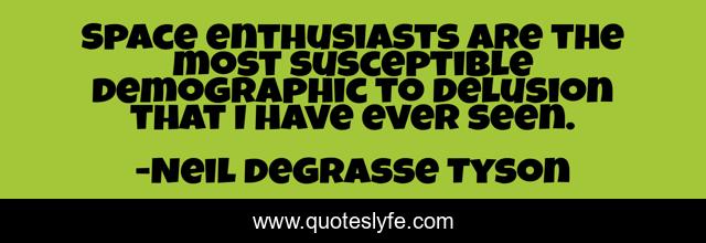 This page presents the quote "Space enthusiasts are the most susceptible demographic to delusion that I have ever seen.". Author of this quote is Neil deGrasse Tyson. This quote is about seen, delusion, demographic,.