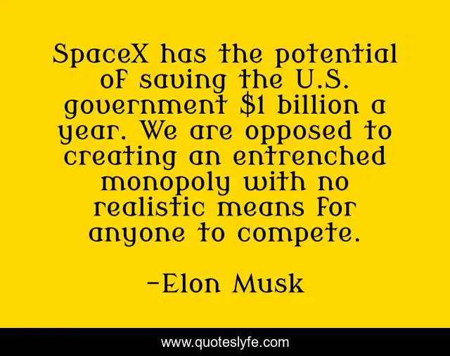 This page presents the quote "SpaceX has the potential of saving the U.S. government $1 billion a year. We are opposed to creating an entrenched monopoly with no realistic means for anyone to compete.". Author of this quote is Elon Musk. This quote is about potential, compete, creating,.