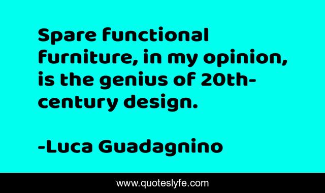 This page presents the quote "Spare functional furniture, in my opinion, is the genius of 20th-century design.". Author of this quote is Luca Guadagnino. This quote is about genius, furniture, opinion,.