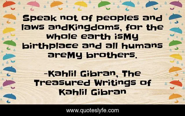 This page presents the quote "Speak not of peoples and laws andKingdoms, for the whole earth isMy birthplace and all humans areMy brothers.". Author of this quote is Kahlil Gibran, The Treasured Writings of Kahlil Gibran. This quote is about connectedness, humanity,.