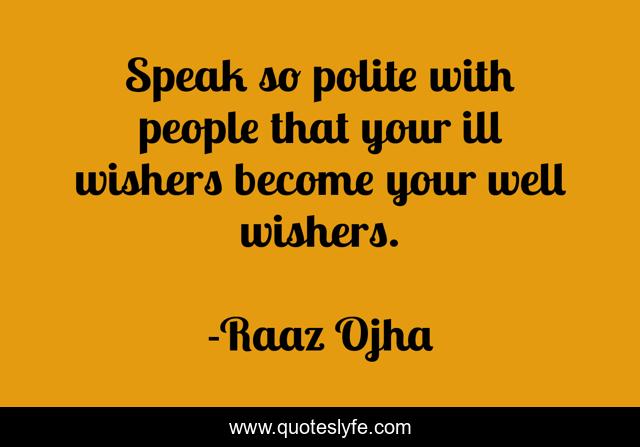 This page presents the quote "Speak so polite with people that your ill wishers become your well wishers.". Author of this quote is Raaz Ojha. This quote is about well-wishers, ill-wishers, polite, words, speak,.