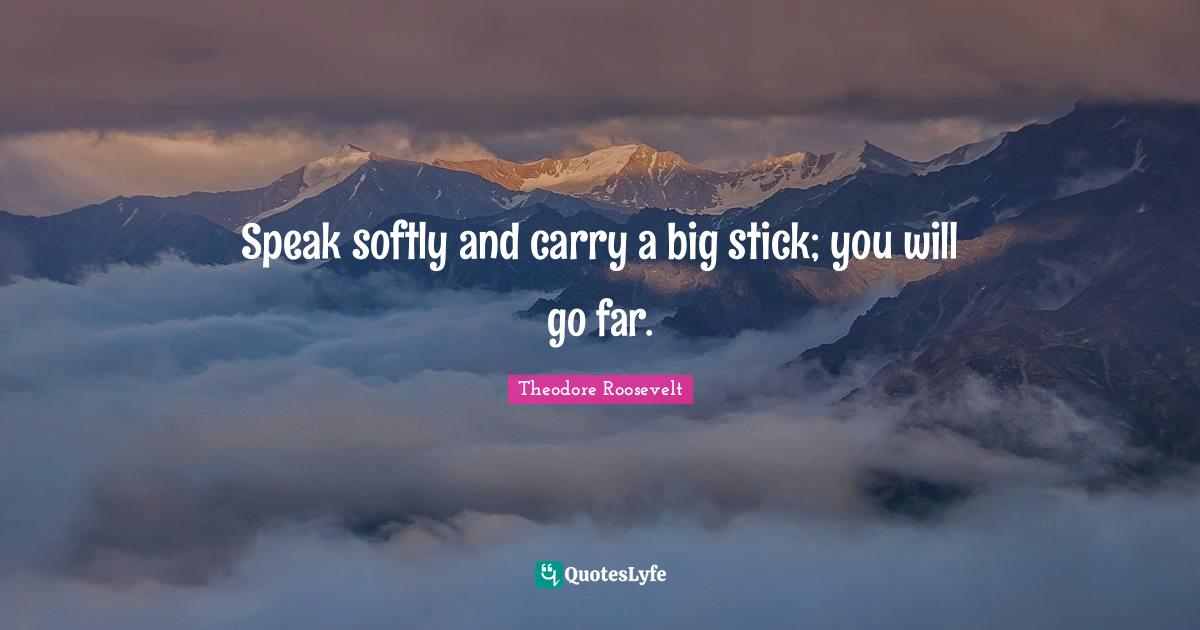 This page presents the quote "Speak softly and carry a big stick; you will go far.". Author of this quote is Theodore Roosevelt. This quote is about leadership, presidential, speak softly, sticks,.