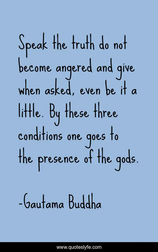 This page presents the quote "Speak the truth do not become angered and give when asked, even be it a little. By these three conditions one goes to the presence of the gods.". Author of this quote is Gautama Buddha. This quote is about anger, giving, truth,.