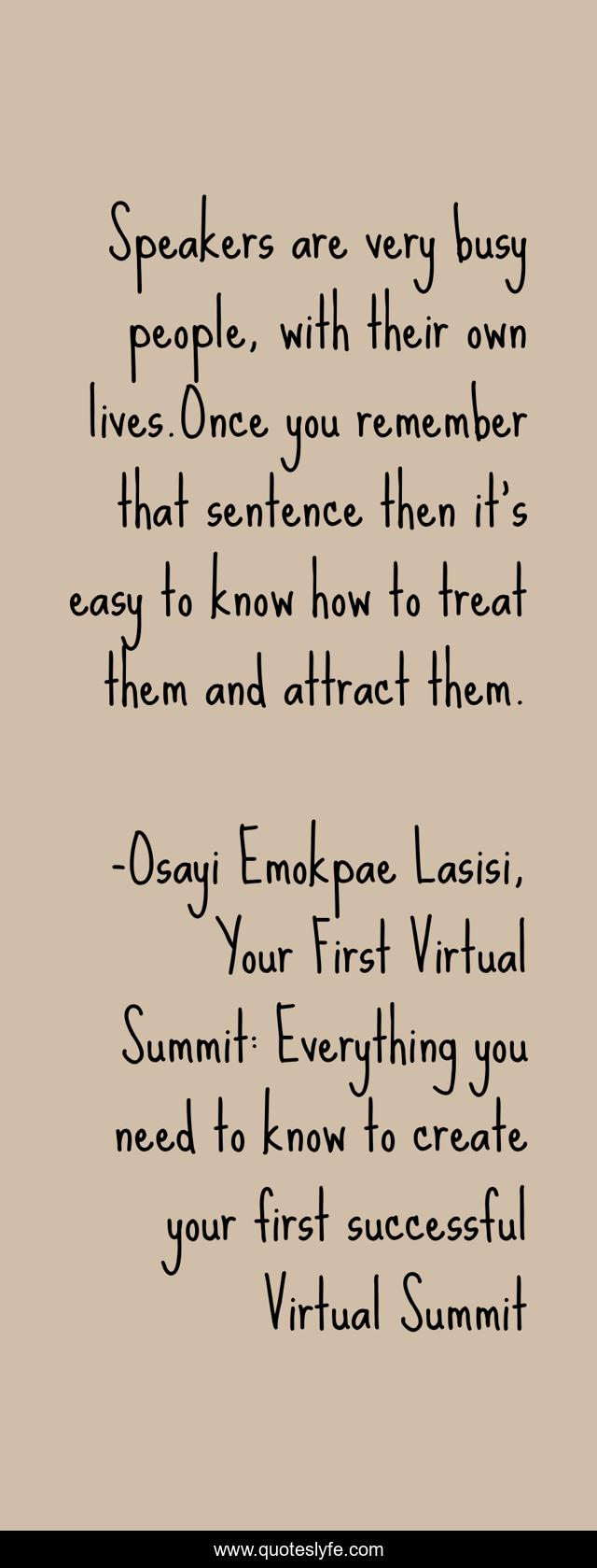 This page presents the quote "Speakers are very busy people, with their own lives.Once you remember that sentence then it’s easy to know how to treat them and attract them.". Author of this quote is Osayi Emokpae Lasisi, Your First Virtual Summit: Everything you need to know to create your first successful Virtual Summit. This quote is about virtual-summit, speakers, event, business,.