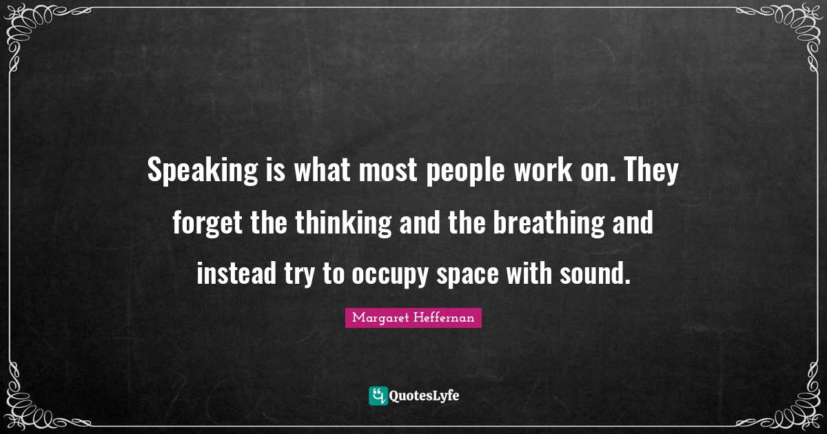 This page presents the quote "Speaking is what most people work on. They forget the thinking and the breathing and instead try to occupy space with sound.". Author of this quote is Margaret Heffernan. This quote is about thinking, work, people,.