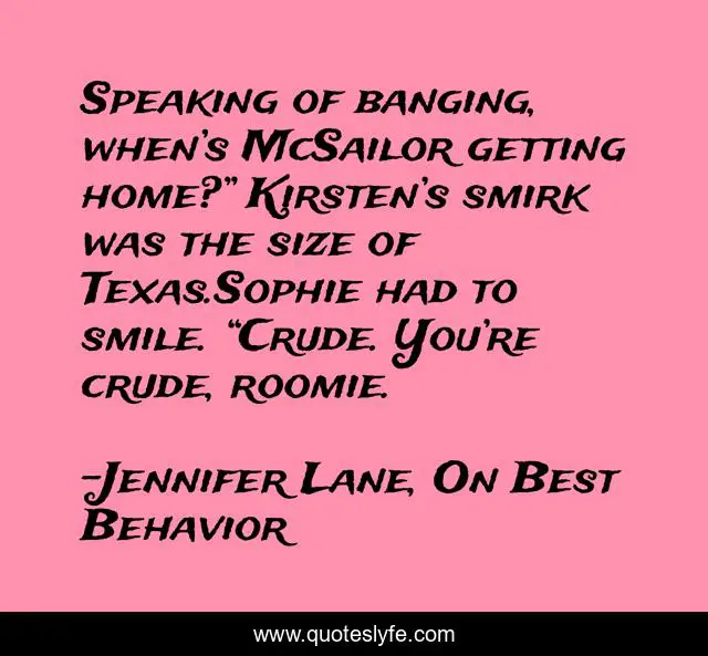 This page presents the quote "Speaking of banging, when’s McSailor getting home?” Kirsten’s smirk was the size of Texas.Sophie had to smile. “Crude. You’re crude, roomie.". Author of this quote is Jennifer Lane, On Best Behavior. This quote is about apartment, the-conduct-series, prison, crime, romance, roommates, sophie-taylor, romantic-suspense, parole,.