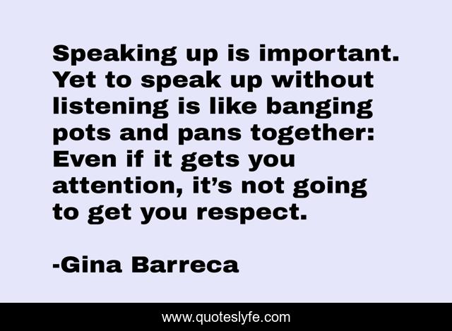This page presents the quote "Speaking up is important. Yet to speak up without listening is like banging pots and pans together: Even if it gets you attention, it’s not going to get you respect.". Author of this quote is Gina Barreca. This quote is about conversation, attention, speaking-up, respect,.