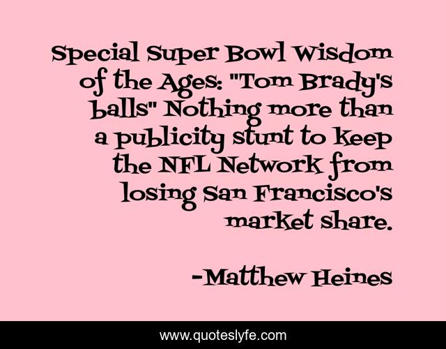 This page presents the quote "Special Super Bowl Wisdom of the Ages: "Tom Brady's balls" Nothing more than a publicity stunt to keep the NFL Network from losing San Francisco's market share.". Author of this quote is Matthew Heines. This quote is about humorous, nfl, humor, daily,.