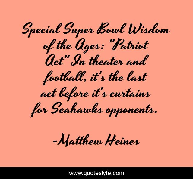 This page presents the quote "Special Super Bowl Wisdom of the Ages: "Patriot Act" In theater and football, it's the last act before it's curtains for Seahawks opponents.". Author of this quote is Matthew Heines. This quote is about funny, humourous, comedy, humor, quote-of-the-day,.
