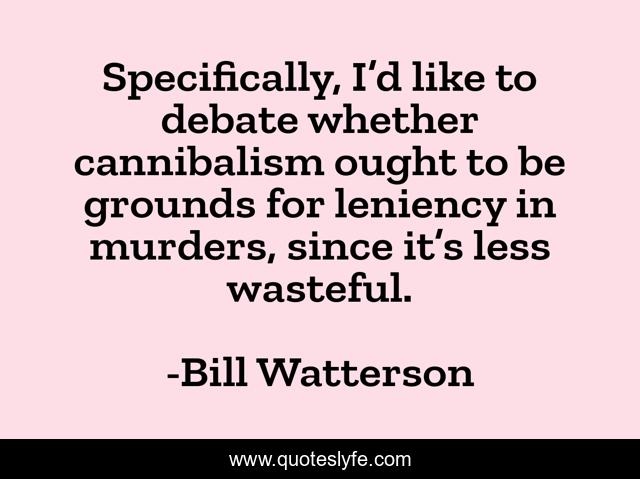This page presents the quote "Specifically, I’d like to debate whether cannibalism ought to be grounds for leniency in murders, since it’s less wasteful.". Author of this quote is Bill Watterson. .