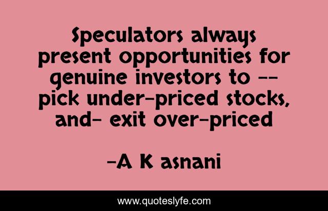 This page presents the quote "Speculators always present opportunities for genuine investors to -- pick under-priced stocks, and- exit over-priced". Author of this quote is A K asnani. This quote is about finance, money, share, planning, stocks, investment, wealth,.