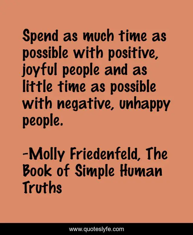 This page presents the quote "Spend as much time as possible with positive, joyful people and as little time as possible with negative, unhappy people.". Author of this quote is Molly Friedenfeld, The Book of Simple Human Truths. This quote is about spreading-sunshine, joy, positivity, positive-and-joy, shining-your-light, happiness,.
