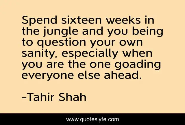 This page presents the quote "Spend sixteen weeks in the jungle and you being to question your own sanity, especially when you are the one goading everyone else ahead.". Author of this quote is Tahir Shah. This quote is about sanity, journey, expedition, jungle, team,.